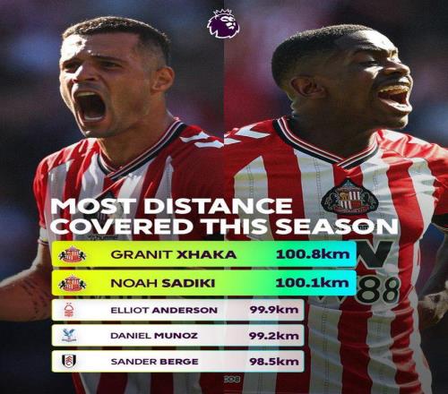 雷速体育10月29日报道宣称 本赛季英超前9轮比赛已全部战罢,英超官方于今天列出了一份赛季至今球员跑动距离的排名榜单。在这份榜单中只有扎卡与萨迪基两位球员的跑动距离超过了100km,而他们正好都来自黑猫桑德兰。目前桑德兰位列英超第4,黑猫回到英超的第一赛季便取得如此令人惊喜的成绩,这与球员不惜体力的跑动所带来的活力息息相关。